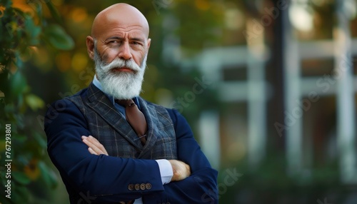 Elegant elderly businessman with a beard posing with crossed arms in a natural setting