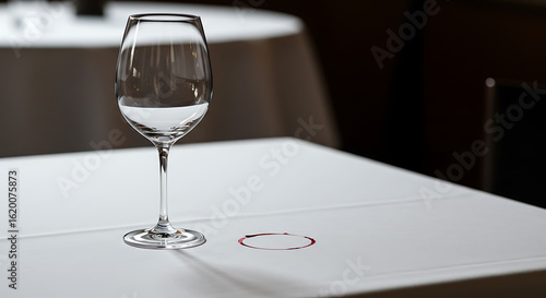 wine, glasses, stemware, empty, clear, transparent, beverage, alcohol, dining, eatery, table, tablecloth, stain, red, circle, mark, spill, elegant, fine dining, glassware, bar, celebration, party, event