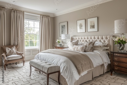 bedchamber, manor, elegant, sleek, neutral, tone, grey, wall, bed, linen, white, soft, armchair, plush, storage, bench, foot, small, window, natural, lighting, tranquil, atmosphere, interior, design, comfort, luxury, relaxation, decor, furniture, stylish, serene, ambience, space, calm, peaceful, sophisticated, classic, traditional, cosy, refined, chic, minimalistic, light, airy, retreat, haven, restful