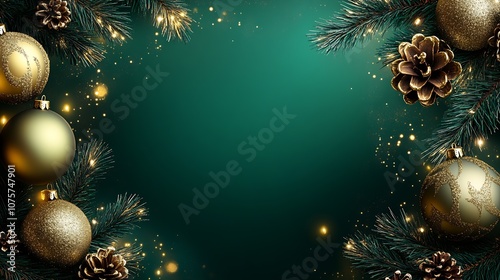 Elegant Festive Green Christmas Background Frame with Pine Branches and Golden Accents : Generative AI