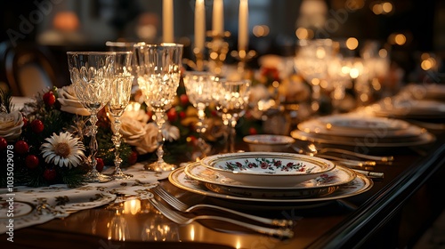 Elegant Festive Table Setting with Crystal Glasses, Candles, and Floral Decorations for a Special Occasion.