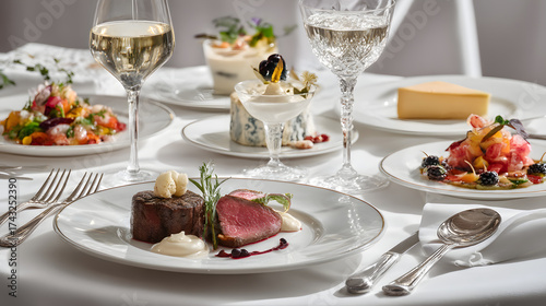Elegant Fine Dining Table Displaying Gourmet Dishes with Exquisite Presentation and Sophisticated Tableware