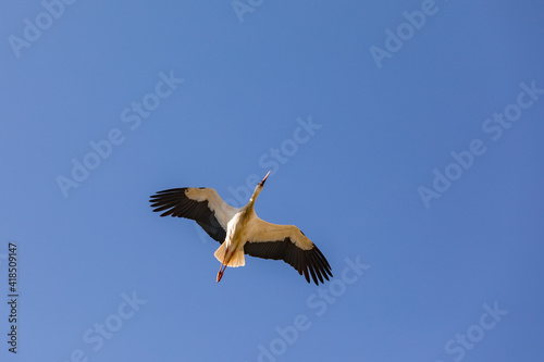 Elegant fliegender Storch vor blauem Himmel direkt von unten