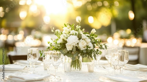 Elegant floral arrangement on a beautifully set outdoor table, illuminated by warm sunlight, perfect for weddings or special events.
