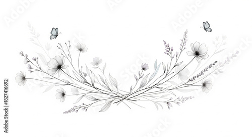 Elegant floral design with butterflies fluttering on a clean white background, perfect for wedding invitations or graceful branding projects