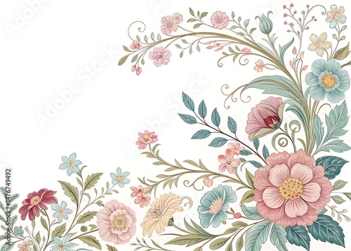floral, flower, pastel, leaf, stem, branch, elegant, design, pink, blue, cream, beige, white, illustration, artwork, nature, botanical, bloom, blossom, ornate, swirl, vine, artistic, decorative, pattern, background, watercolor, vintage, spring, summer, garden, delicate