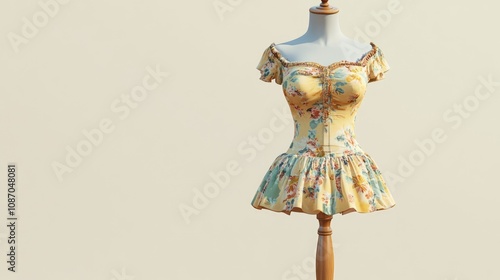 Elegant Floral Dress on Display, Vintage Inspired Fashion Piece with Off-Shoulder Design Perfect for Summer Weddings, Parties and Fashion Photography Sessions