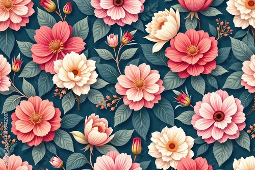 Elegant floral pattern vector illustration, perfect for textile, wallpaper, and design projects Beautiful blooms and leaves in a repeating design , image, elegant