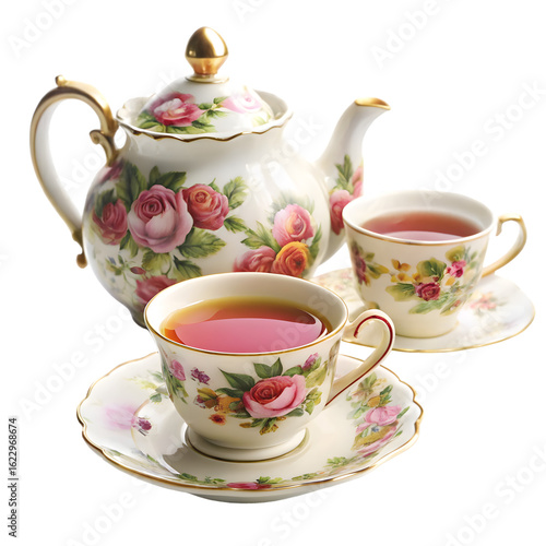 tea, cup, saucer, teapot, rose, flower, drink, beverage, hot, liquid, ceramic, porcelain, floral, pattern, pink, gold, handle, lid, spout, traditional, elegant, classic, vintage, tableware, kitchen utensile, serving, refreshment, afternoon, time, transparent