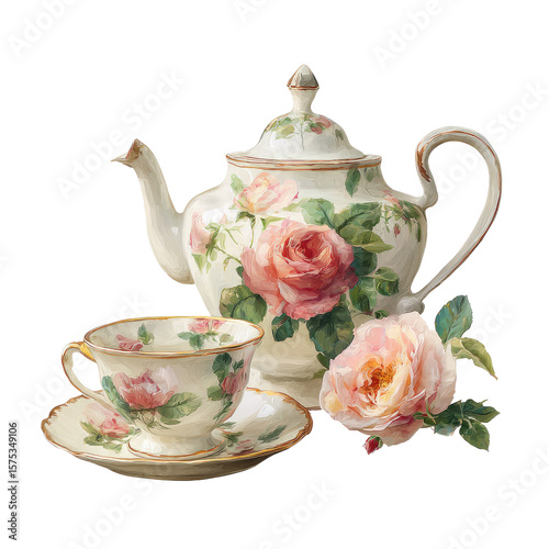 Elegant Floral teapot and cups Set with Roses isolated on transparent white background, clipping path