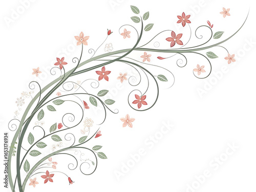 floral, vine, divider, illustration, elegant, delicate, blossom, leaf, swirl, nature, botanical, decorative, ornamental, flourish, organic, vintage, art nouveau, graphic design, accent, border, springtime, romantic, peach, green, white, coral, pink, red, vector