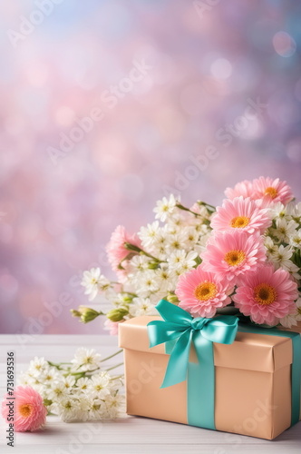 gift, box, ribbon, pink, flower, tulip, soft, elegant, present, spring, bloom, celebration, floral, flower petals, bokeh, birthday, wrapped, nature, beauty, surprise, festive, delicate, pastel, wooden, table, background, romance, love, anniversary, satin, shiny, luxury, giving, occasion, cheerful, happiness, bouquet, craft, fresh, season, wood, texture, glowing, morning, peony, reddening, teal, blooming