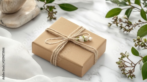 gift, box, elegant, wrapped, brown, paper, twine, flower, marble, surface, greenery, accent, delicate, decoration, present, wrapping, nature, arrangement, rustic, ornamental, celebration, cardboard box, seasonal, aesthetic, style, home, decor, natural, festive, design, chic, boutique, surprise, hand-made, floral, luxury, artisan, minimal, beauty, table, holiday, anniversary, gift wrap, artful, texture, simplicity, presentation, soft