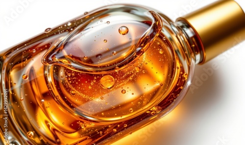 Elegant Glass Bottle Filled with Golden Perfume and Air Bubbles on White Background