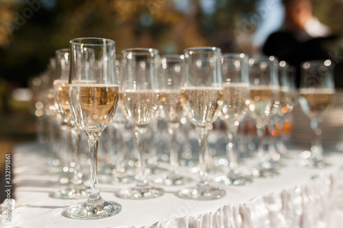 Elegant glasses with champagne standing in a row on serving table during party or celebration