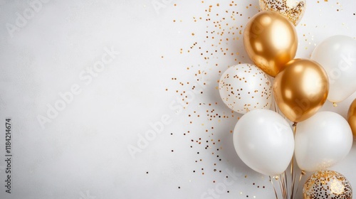 Elegant gold & white balloons; festive confetti. Perfect for celebrations!