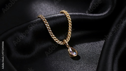jewellery, luxury, fashion, elegant, chain, pendant, gemstone, diamond, gold, satin, fabric, black, shiny, sparkling, expensive, precious, accessory, gift, designer, modern, minimalist, heirloom, bijouterie, solitaire, faceted, lustrous, rich, velvet, silk, texture, studio shot, macro, closeup, detail