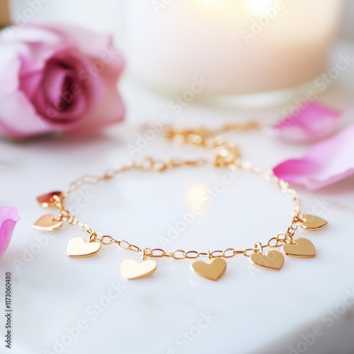 Elegant gold heart bracelet with roses and soft candlelight in a serene setting