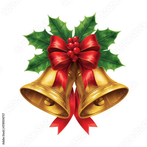Elegant golden christmas bells with red bow and holly leaves festive design