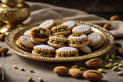 Elegant gold-plated plate filled with date-filled Maamoul cookies and pistachios