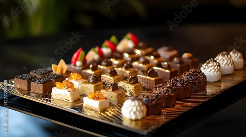 dessert, platter, epicure, presentation, elegant, design, arrangement, styling, culinary, artistry, style, luxurious, fine, creative, tasting, event, high-end, decoration, intricate, visual, gold, decor, food, treat, delicacy, sweet, art, dining