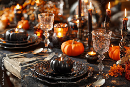 halloween, dinner, table, elegant, decoration, black, orange, candle, wine, goggles, festive, skittish, celebration, autumn, stylish, decor, evening, holiday, setting, centrepiece, moody, posh, eerie, party, seasonal, pumpkin, dark, atmosphere, glow, plate, napkin, silverware, candlelight, theme, indoor, sophisticated, costume, october, refined, mysterious, gothic, detail, arrangement, hosting, ambience, tableware