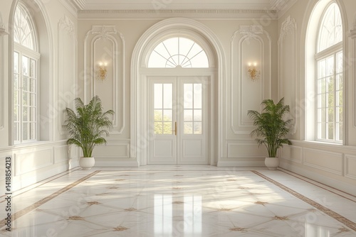 hallway, interior, architecture, archway, door, marble, floor, plant, potted, molding, design, symmetry, light, window, decoration, ornate, classic, style, neutral, tone, elegant, upscale, reception, entrance, daytime, bright, airy, roomy, luxurious, sophisticated, traditional, indoor, residence, property, apartment, estate, trim, wall, panel, sconce, gold, leaf, pattern, perspective, white, home, artwork