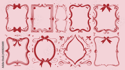 Elegant hand-drawn doodle frames with hearts, bows, and wavy lines in vintage coquette style for invitations and stationery