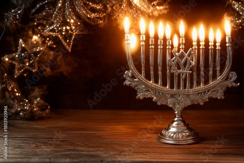 Elegant Hanukkah display with candlestick and glittering decorations in warm evening light