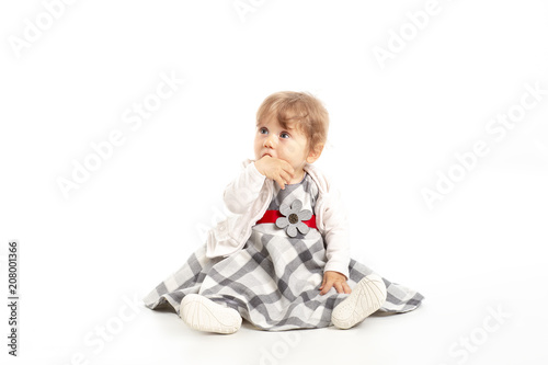 Elegant Happy baby girl 1 year old sitting on the studio floor. White Background. Concept Happiness.