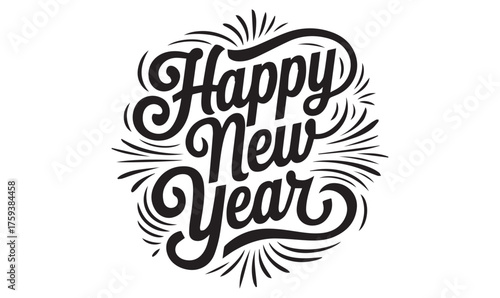 new, year, happy, typography, script, flourish, greeting, celebration, festive, elegant, decorative, minimalist, black, white, vector, clip art, illustration, artwork, design, calligraphy, stylish, seasonal, holiday, banner, poster, icon, classic, modern, text, message, monochrome, decoration, label