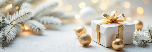 banner, christmas, holiday, gift, gold, white, new year, present, ornament, festive, winter, atmosphere, celebration, sparkle, seasonal, decor, foliage, elegance, joy, ribbon, shiny, light, creative, arrangement, cosy, style, beauty, tradition, aesthetic, design, luxury, tranquility, decoration, box, christmas, gold, bauble