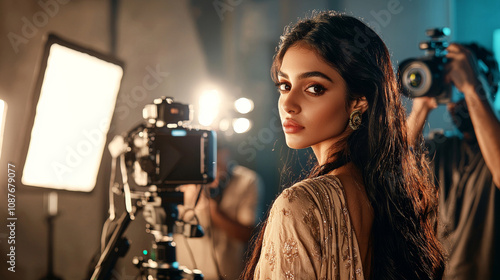 india, indian, elegant, model, traditional, outfit, posing, cinematic, studio, woman, photographer, camera, person, people, beauty, work, 1, looking, photo