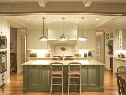 kitchen, island, cabinet, green, elegant, design, modern, contemporary, style, home, decor, interior, lighting, pendant, light, counter, granite, wood, floor, hardwood, appliance, oven, microwave, stove, range, cooktop, sink, faucet, chair, backsplash, tile, white, creamy, calm, serene, sophisticated, roomy, bright, warm, inviting, comfortable, luxury, upscale, refined, taste, beautiful, stunning