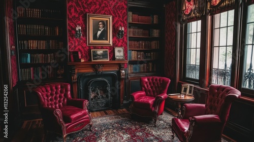library, room, chair, red, bookshelf, book, fireplace, mantle, portrait, painting, wall, wallpaper, dark, wood, elegant, antique, vintage, classic, rich, maroon, leather, ornate, cosy, comfortable, window, frame, picture, table, side, small, floor, carpet, rug, burgundy, plush, tufted, decor, interior, design