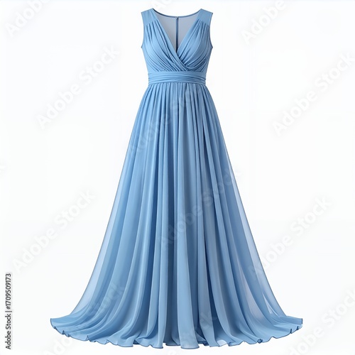 Elegant, light blue chiffon gown with V-neckline isolated on a stark white backdrop