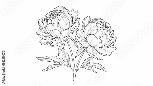 peony, flower, blooming, blossom, botanical, illustration, drawing, vignetting, line art, outline, art, design, nature, plant, floral, garden, stem, leaf, white background, isolated, vintage, hand-drawn, elegant, delicate, beauty, romantic, spring, summer, decoration, graphic, simple, minimalist, organic, growth, fresh, vibrant, soft, graceful, artistic, creative, symbol, icon, vector, monochrome, black-and-white, fine art, detailed