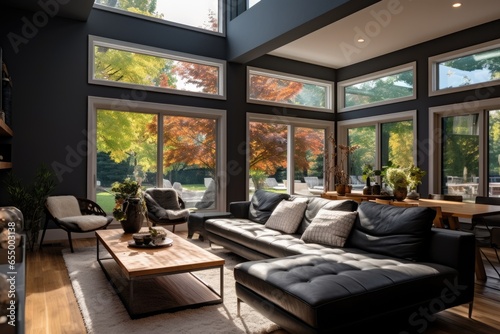 elegant living room adorned with sizable windows and a fireplace, exuding a modern ambiance