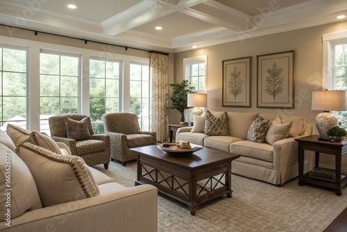living room, interior design, home decor, sofa, couch, armchair, furniture, coffee table, window, natural light, bright, roomy, comfortable, cosy, elegant, modern, traditional, beige, cream, pillow, lamp, rug, artwork, room