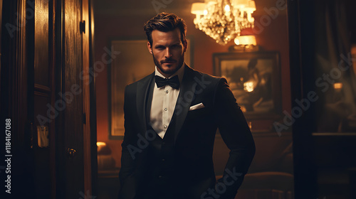 Elegant Man In Tuxedo Stands In Luxurious Room