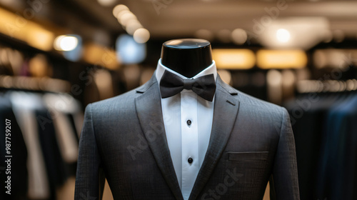 boutique, no people, shop, tuxedo, front view, buttons, jacket, indoor, collar, suit, menswear, department store, style, display, business, elegance, retail, copy space, garment, shopping, blurred background, high-end, black, shirt, tailor, classic, apparel, luxury, white, pant, closeup, clothing, mannequin, consumerism, bow tie, gentleman, success, fashion, elegant, design, store, grey