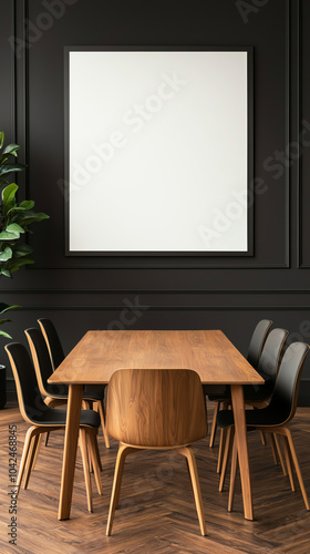 Elegant minimalist dining area featuring wooden table and stylish chairs against a dark wall