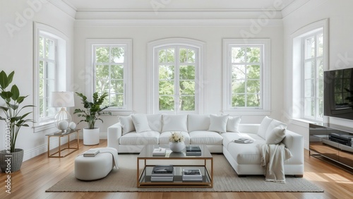 Elegant Minimalist Living Room with White Sofa, Modern Decor, and Natural Light for Relaxation and Entertainment