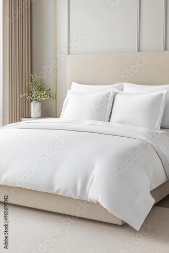 Elegant modern bedroom with a pristine white bedspread and decorative pillows, creating a serene and inviting atmosphere.