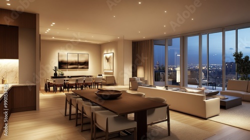 Elegant modern living room and dining area with panoramic city views during twilight hours