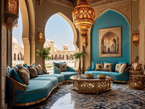 moroccan, lounge, interior, design, luxury, decor, turquoise, gold, couch, accent, intricate, detail, arch, window, view, mosque, arabic, arabesque, pattern, pillow, cushion, ornate, table, hot drink, gold, floral, artwork, frame, tile, floor, patterned, stylish, elegant, beautiful, modern, traditional, culture, architecture, grand, opulent