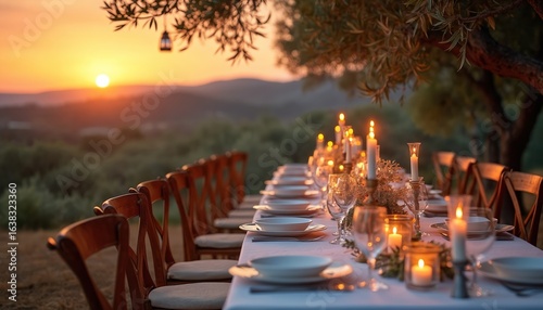 Elegant outdoor dinner table setting at sunset in tuscan countryside. Romantic vineyard ambiance features wooden chairs, white tablecloth, candles, wine glasses, and plates.