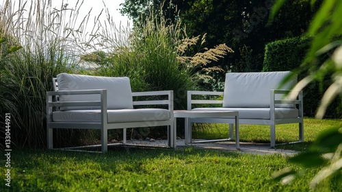 seating, chair, cushion, garden, furniture, relaxation, summer, serene, contemporary, nature, greenery, patio, sunlight, stylish, peaceful, design, architecture, leisure, comfort, lifestyle, backyard, cosy, space, tranquil, outdoors, modern, decor, landscape, summer day, minimalist, home, setting, exterior, soft, texture, environment, shade, natural light, arrangement, inviting, atmosphere, vibrant, escape
