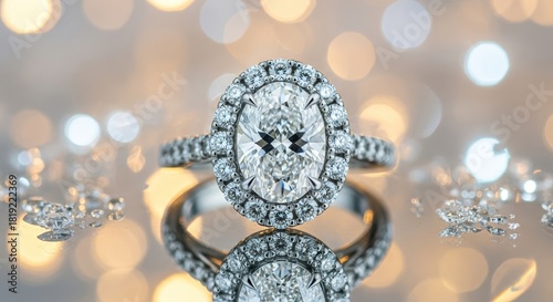 Elegant oval diamond ring with halo setting reflecting on a shiny surface