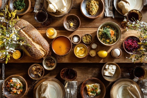 Elegant overhead view of a beautifully arranged Passover dinner table with traditional dishes and decorations for a festive celebration